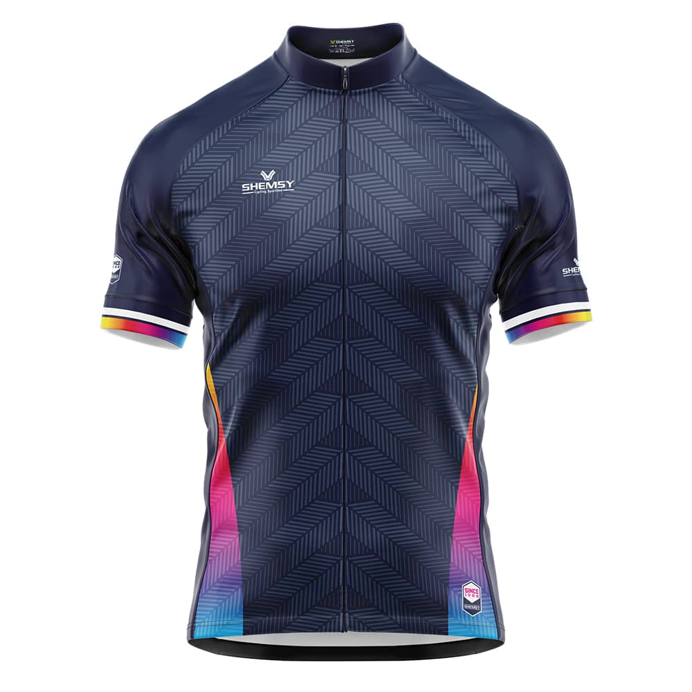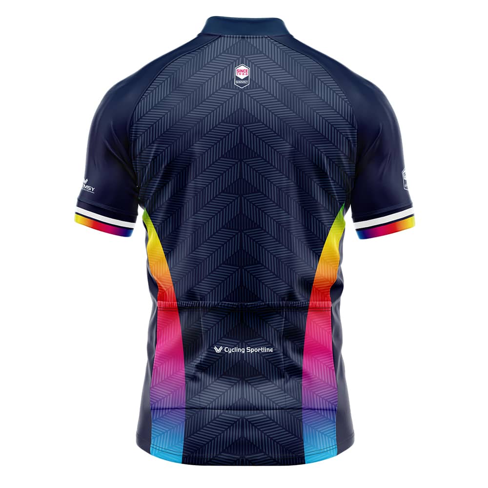 Le maillot de cyclisme été mixte Rainbow, un maillot au design original et unique ! Couleur dominante bleu marine, tissu HEXA 100% Polyester avec effet Pro Dry pour une bonne régulation de la chaleur et la transpiration. Zip intégral, 3 poches au dos, bande silicone au bas du maillot pour un meilleur maintient pendant l’effort.